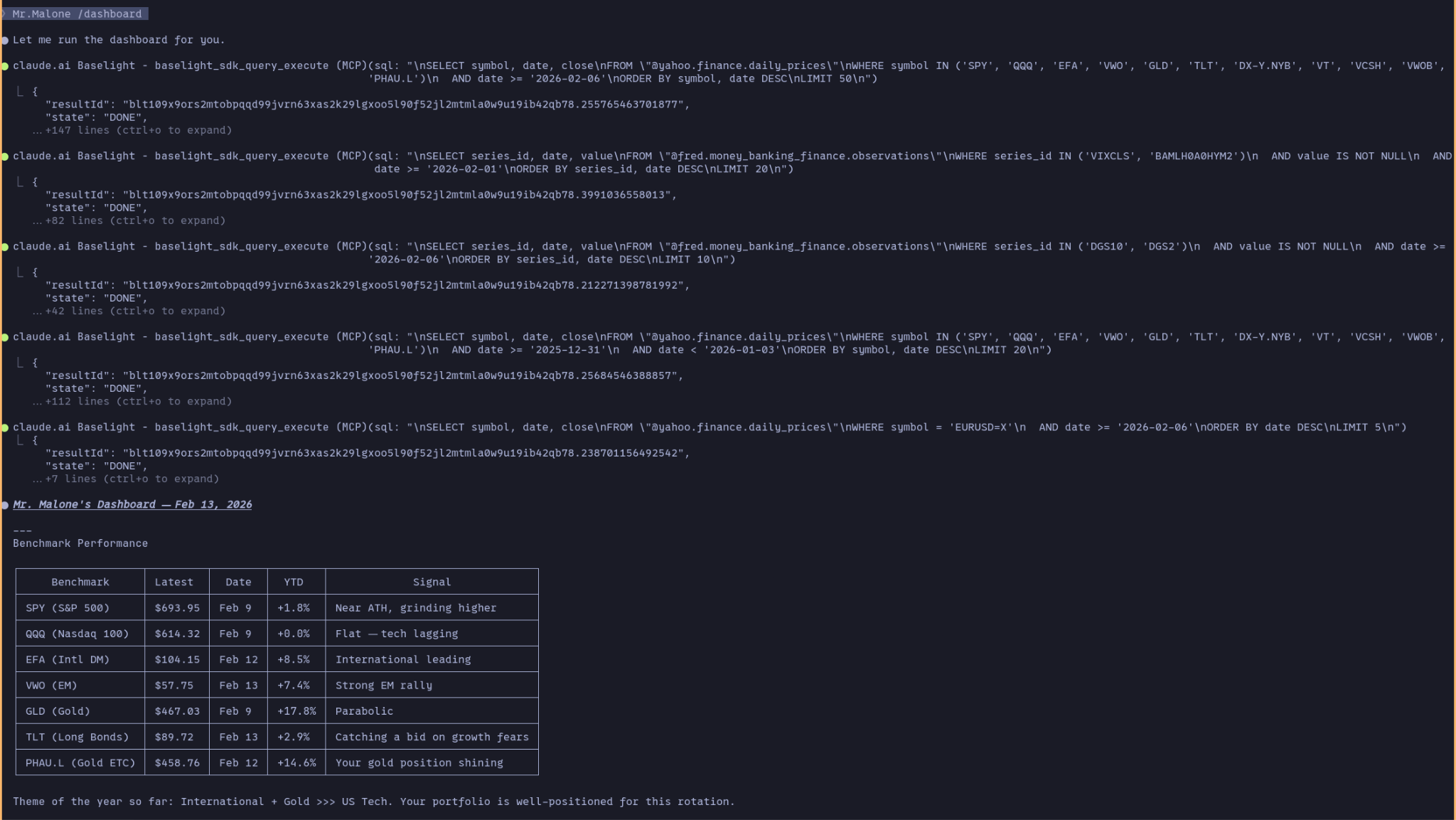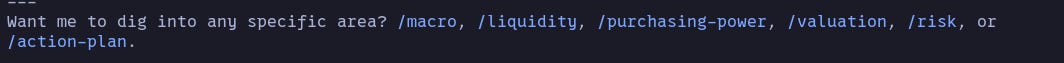 Here’s an example run of Mr. Malone. It first performs a few Baselight queries to build its context, and then generates an output with the analysis. Of course, the analysis is way more extensive and includes a detailed analysis over my portfolio (but I’ll redact that for now, if you are interested about my allocation and want to discuss investments drop me a message).