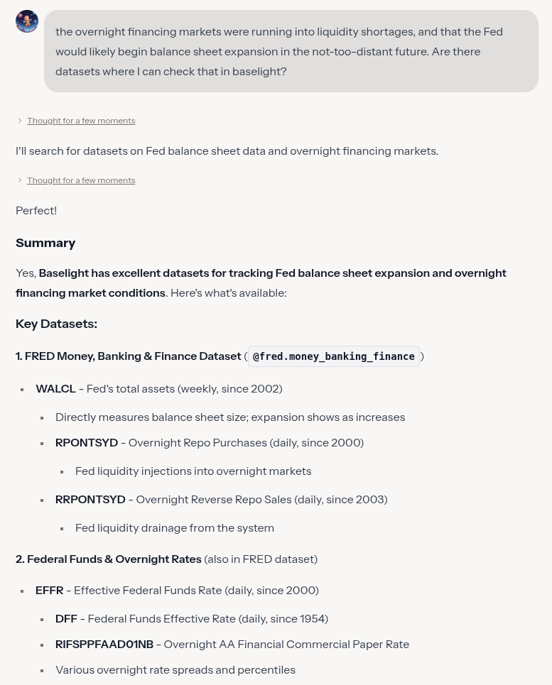 I then asked Baselight to make an analysis about recent events where the FED had to step in to inject emergency liquidity into the repo markets. It came up with this cool table and descriptive.