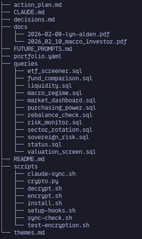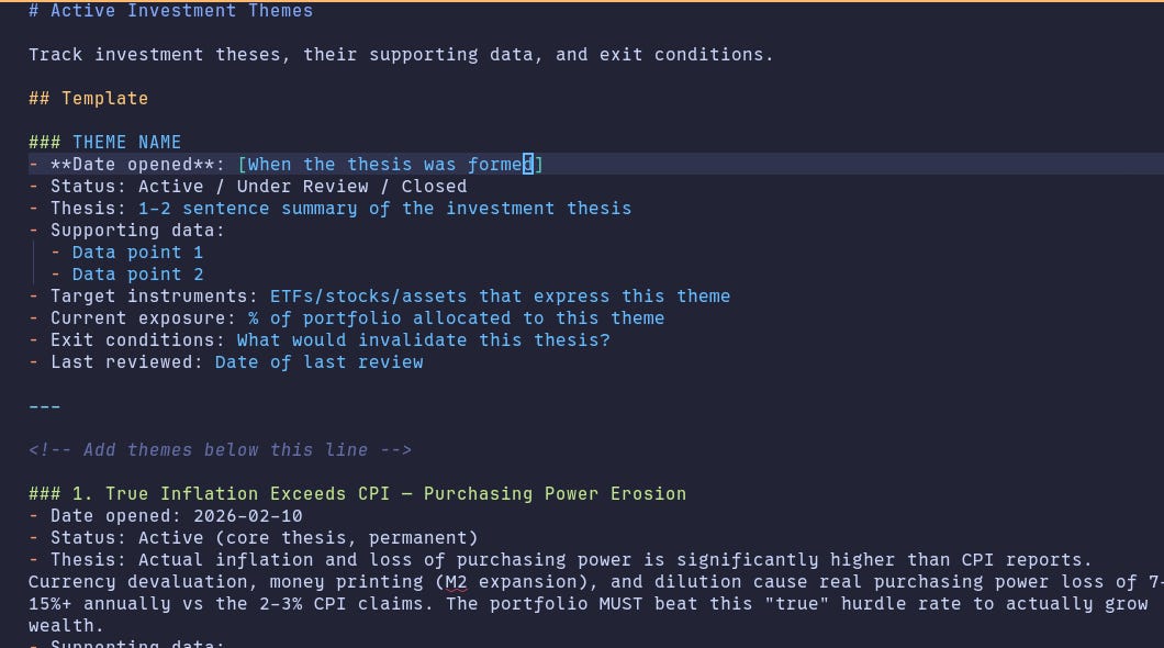 Files like portfolio.yaml, action_plans.md and decisions.yaml make up the memory of the agent, and other files like themes.md are used as a way to extend the core behavior of the agent to align with my most recent investment theses.