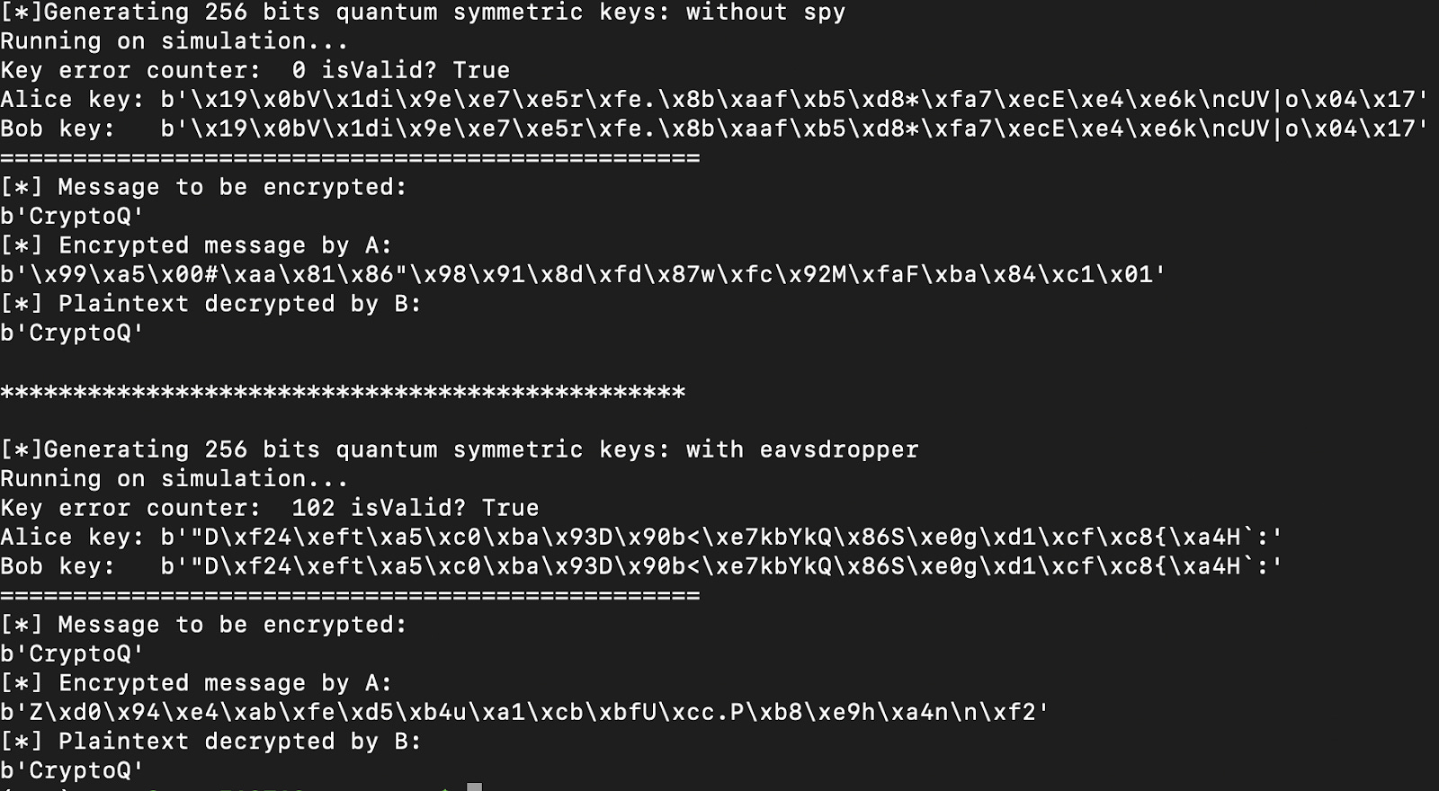 And with our keys generated and shared through our quantum channel, we could seamlessly use our classical algorithms to encrypt and decrypt our data (as shown in the sample execution depicted above). Check our project’s github repo in case you want to give a try to our algorithm (disclaimer: I haven’t looked at this code for more than a year, so it may be significantly outdated. Post an issue if you want me to have a look at it).