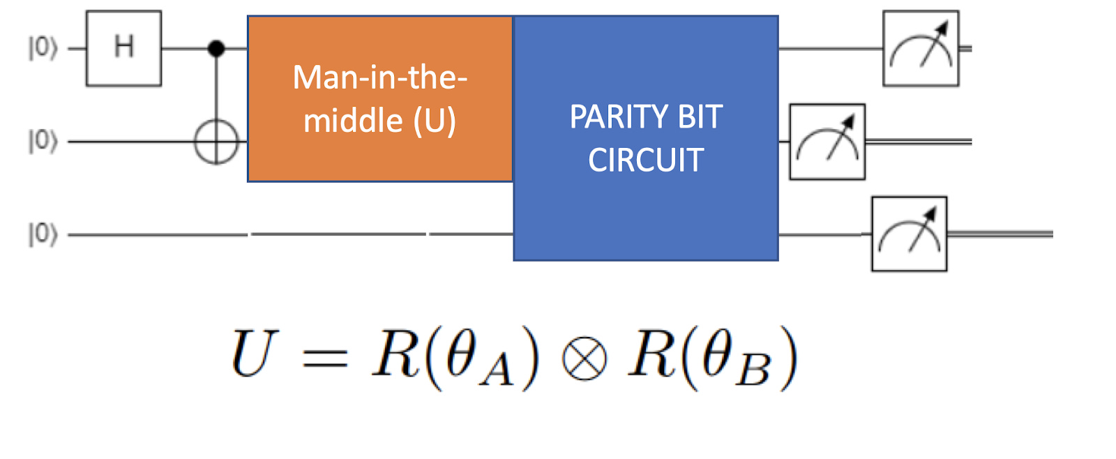 Modelling this scenario using Qiskit was quite an interesting and challenging work, but still not enough for a 24h hackathon. We thought then of using a parity qubit as a tool to detect potential noise or malicious effects over our key distribution channel. Both our qubits for A and B are entangled, so when measuring them both must collapse to the same value. If this is not the case, it means that something has happened in the channel. Consequently, we developed a quantum circuit with a parity qubit that was set to 1 if both qubits had the same value, and 0 otherwise. We transmitted this parity qubit with each independent qubit of the key so that the receiver could detect if something had disturbed the key exchange.