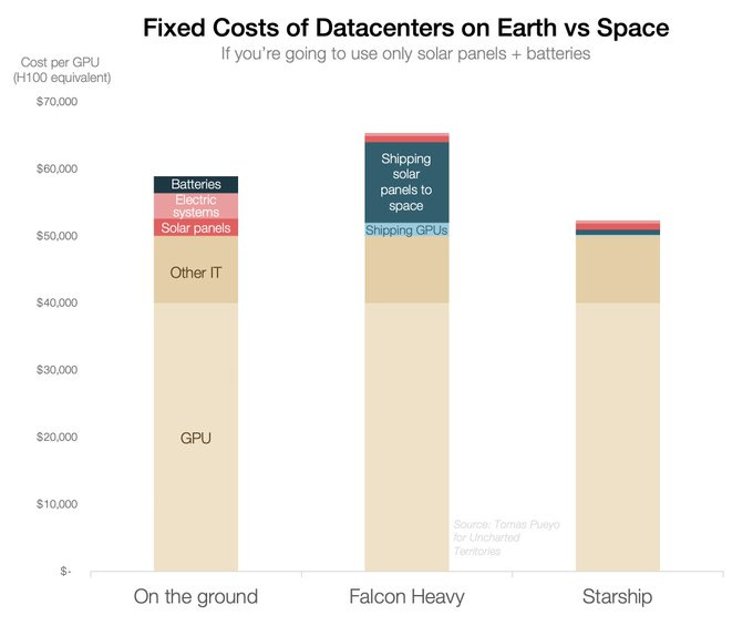To complement the foundation with some an economic framing, here’s an interesting tweet from Tomas Pueyo that breaks down at a high-level the fixed cost of on-the-ground and space data centres in order to understand the level of savings that can be achieved. There’s also this great write-up from the comma.ai team about what it takes to own and operate an Earth 5M$ data centre (slightly off-topic, but I thought it would be a great reference for those of you that do not understand in-depth what does it take to operate a data centre).